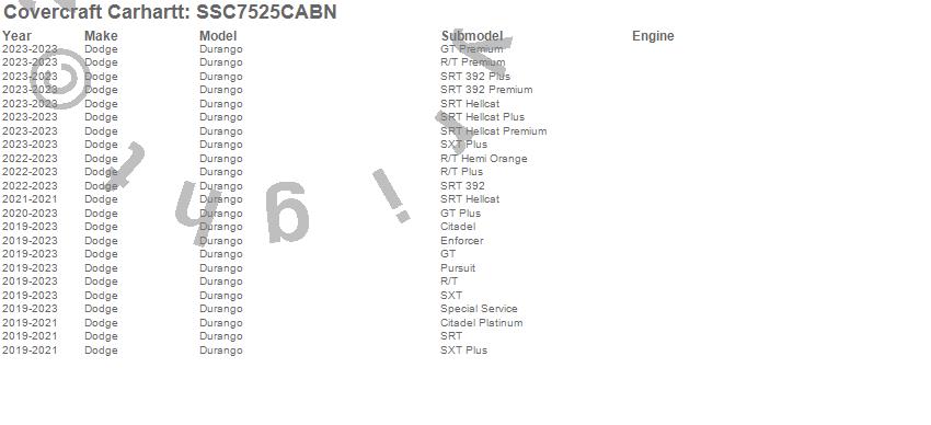 Below is an abbreviated list of applications for the Covercraft Carhartt SeatSaver.Durango, Dodge, 2025, 2024, 2023, 2022, 2021, 2020, 2019