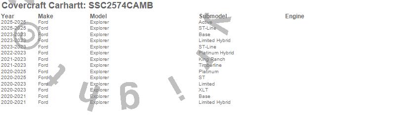 Below is an abbreviated list of applications for the Covercraft Carhartt SeatSaver.Explorer, Ford, 2025, 2024, 2023, 2022, 2021, 2020