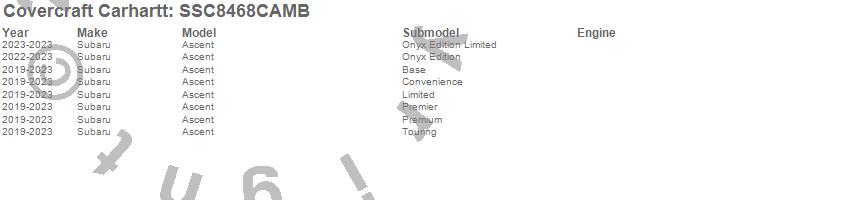 Below is an abbreviated list of applications for the Covercraft Carhartt SeatSaver.Ascent, Subaru, 2025, 2024, 2023, 2022, 2021, 2020, 2019