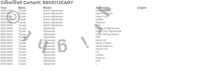 Below is an abbreviated list of applications for the Covercraft Carhartt SeatSaver.Grand Highlander, Highlander, Toyota, 2025, 2024, 2023, 2022, 2021, 2020