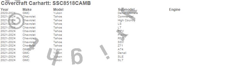 Below is an abbreviated list of applications for the Covercraft Carhartt SeatSaver.Suburban, Tahoe, Yukon, Yukon XL, Chevrolet, GMC, 2026, 2025, 2024, 2023, 2022, 2021