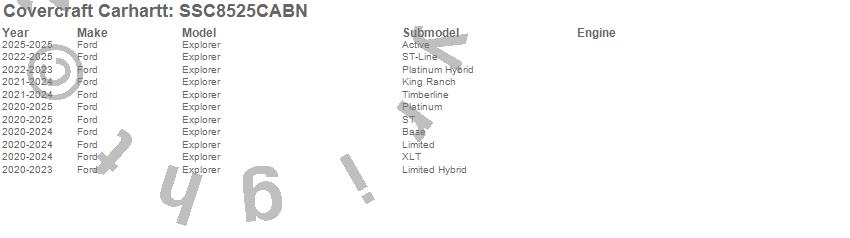 Below is an abbreviated list of applications for the Covercraft Carhartt SeatSaver.Explorer, Ford, 2025, 2024, 2023, 2022, 2021, 2020