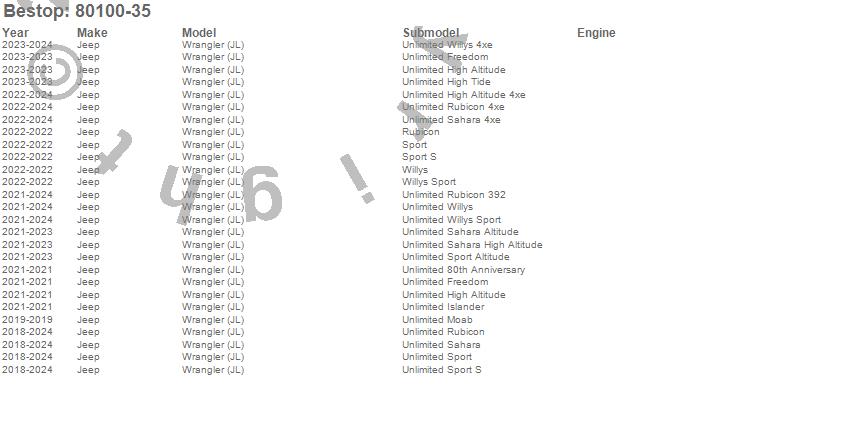 Below is an abbreviated list of applications for the Halftop Soft Top Conversion Kit.Wrangler (JL), Jeep, 2024, 2023, 2022, 2021, 2020, 2019, 2018