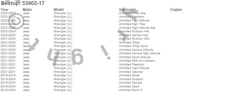 Below is an abbreviated list of applications for the Halftop Soft Top.Wrangler (JL), Jeep, 2024, 2023, 2022, 2021, 2020, 2019, 2018