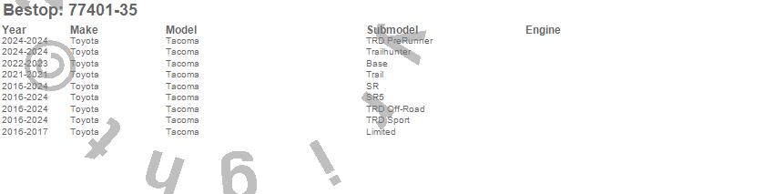 Below is an abbreviated list of applications for the Supertop For Truck 2.Tacoma, Toyota, 2024, 2023, 2022, 2021, 2020, 2019, 2018, 2017, 2016