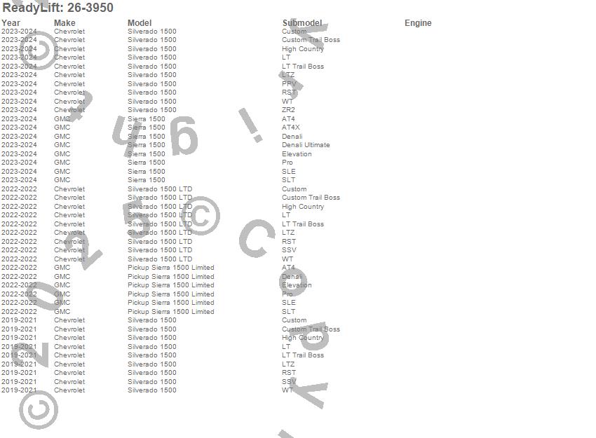 Below is an abbreviated list of applications for the Rear Block Kit.Pickup Sierra 1500 Limited, Sierra 1500, Silverado 1500, Silverado 1500 LTD, Chevrolet, GMC, 2024, 2023, 2022, 2021, 2020, 2019
