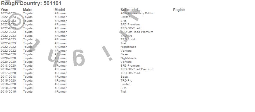 Below is an abbreviated list of applications for the Lifted N3 Struts.4Runner, Toyota, 2024, 2023, 2022, 2020, 2019, 2018, 2017, 2016, 2015, 2014, 2013, 2012, 2011, 2010
