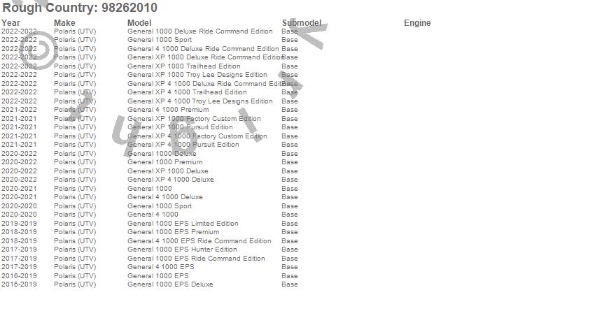 Below is an abbreviated list of applications for the Windshield.General 1000, General 1000 Deluxe, General 1000 Deluxe Ride Command Edition, General 1000 EPS, General 1000 EPS Deluxe, General 1000 EPS Hunter Edition, General 1000 EPS Limited Edition, General 1000 EPS Premium, General 1000 EPS Ride Command Edition, General 1000 Premium, General 1000 Sport, General 4 1000, General 4 1000 Deluxe, General 4 1000 Deluxe Ride Command Edition, General 4 1000 EPS, General 4 1000 EPS Ride Command Edition, General 4 1000 Premium, General XP 1000 Deluxe, General XP 1000 Deluxe Ride Command Edition, General XP 1000 Factory Custom Edition