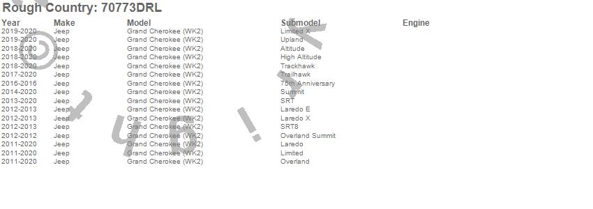 Below is an abbreviated list of applications for the LED Bumper Kit.Grand Cherokee (WK2), Jeep, 2020, 2019, 2018, 2017, 2016, 2015, 2014, 2013, 2012, 2011