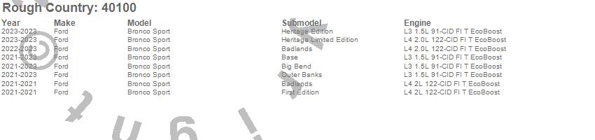 Below is an abbreviated list of applications for the Suspension Lift Kit.Bronco Sport, Ford, 2025, 2024, 2023, 2022, 2021