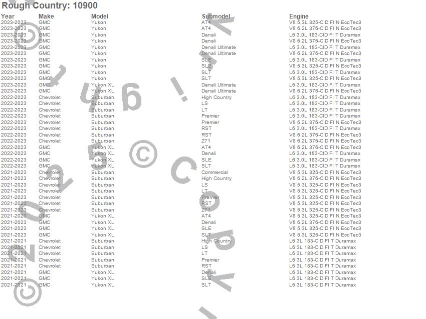 Below is an abbreviated list of applications for the Suspension Lift Kit.Suburban, Yukon, Yukon XL, Chevrolet, GMC, 2024, 2023, 2022, 2021