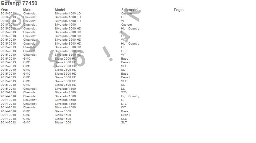 Below is an abbreviated list of applications for the Trifecta e-Series.Sierra 1500, Sierra 2500 HD, Sierra 3500 HD, Silverado 1500, Silverado 1500 LD, Silverado 2500 HD, Silverado 3500 HD, Chevrolet, GMC, 2019, 2018, 2017, 2016, 2015, 2014