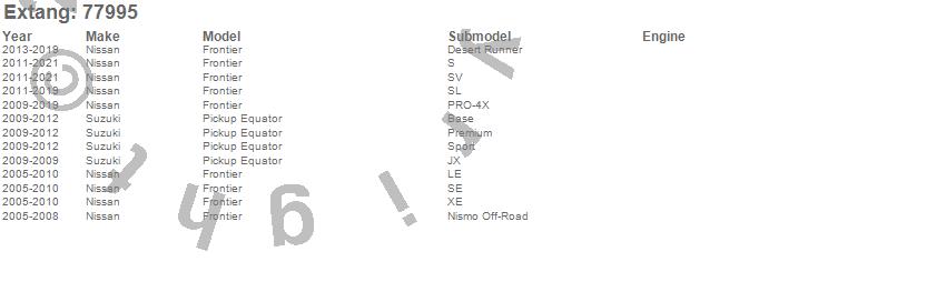 Below is an abbreviated list of applications for the Trifecta e-Series.Equator, Frontier, Nissan, Suzuki, 2021, 2020, 2019, 2018, 2017, 2016, 2015, 2014, 2013, 2012, 2011, 2010, 2009, 2008, 2007, 2006