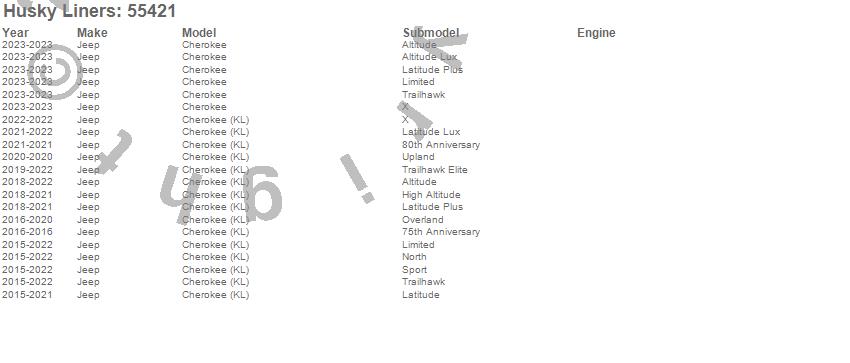 Below is an abbreviated list of applications for the X-act Contour Floor Liner.Cherokee, Cherokee (KL), Jeep, 2023, 2022, 2021, 2020, 2019, 2018, 2017, 2016, 2015