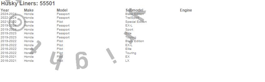 Below is an abbreviated list of applications for the X-act Contour Floor Liner.Passport, Pilot, Honda, 2025, 2024, 2023, 2022, 2021, 2020, 2019, 2018, 2017, 2016