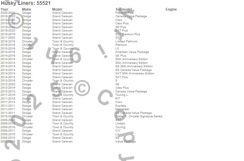 Below is an abbreviated list of applications for the X-act Contour Floor Liner.Grand Caravan, Town & Country, Chrysler, Dodge, 2020, 2019, 2018, 2017, 2016, 2015, 2014, 2013, 2012, 2011, 2010, 2009, 2008