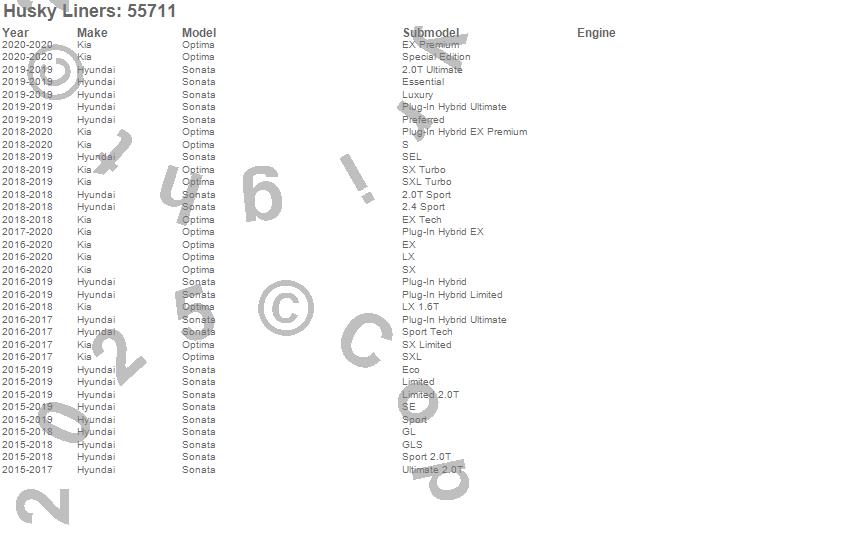Below is an abbreviated list of applications for the X-act Contour Floor Liner.Optima, Sonata, Hyundai, Kia, 2020, 2019, 2018, 2017, 2016, 2015