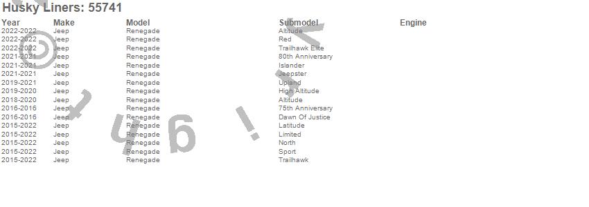 Below is an abbreviated list of applications for the X-act Contour Floor Liner.Renegade, Jeep, 2022, 2021, 2020, 2019, 2018, 2017, 2016, 2015