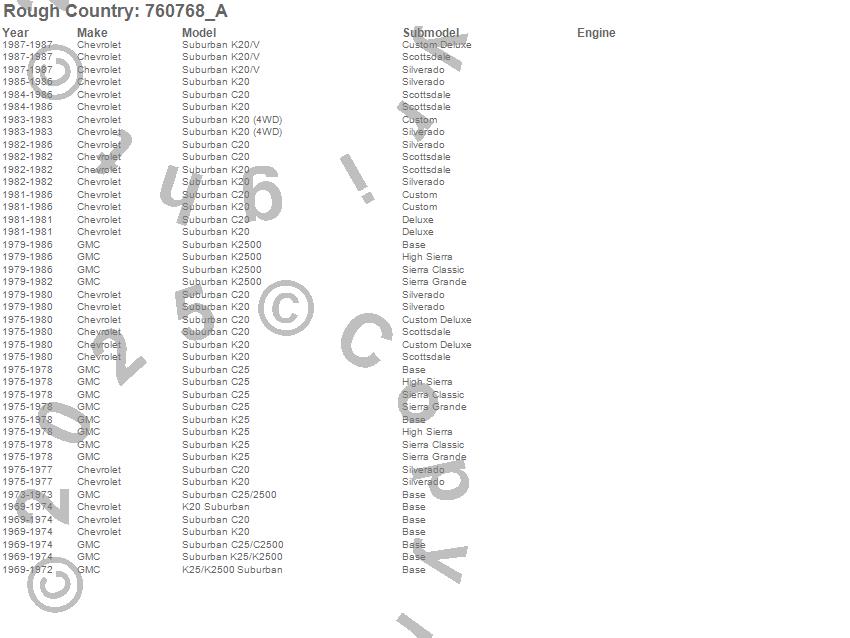 Below is an abbreviated list of applications for the V2 Shock Absorbers.C20 Suburban, C25 Suburban, C25/C2500 Suburban, K20 Suburban, K25 Suburban, K25/K2500 Suburban, K2500 Suburban, V20 Suburban, Chevrolet, GMC, 1987, 1986, 1985, 1984, 1983, 1982, 1981, 1980, 1979, 1978