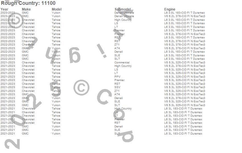 Below is an abbreviated list of applications for the Suspension Lift Kit.Tahoe, Yukon, Chevrolet, GMC, 2024, 2023, 2022, 2021