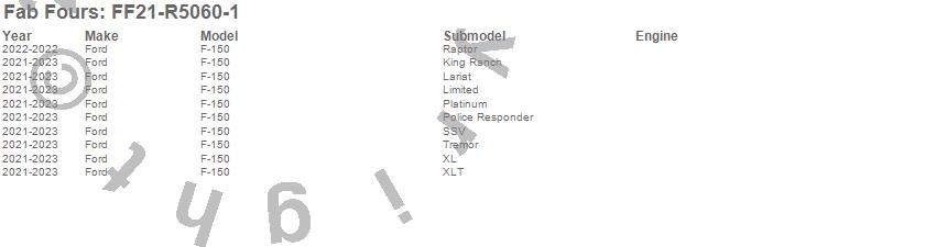 Brand: Fab FoursPart Number: FF21-R5060-1Bumper- Front Type: Full Guard - Incl. Tow Hooks - Lower Guard - 12 Gauge Steel Construction - Black Powder Coat - 194 lbs. WeightUPC: 840113722877
