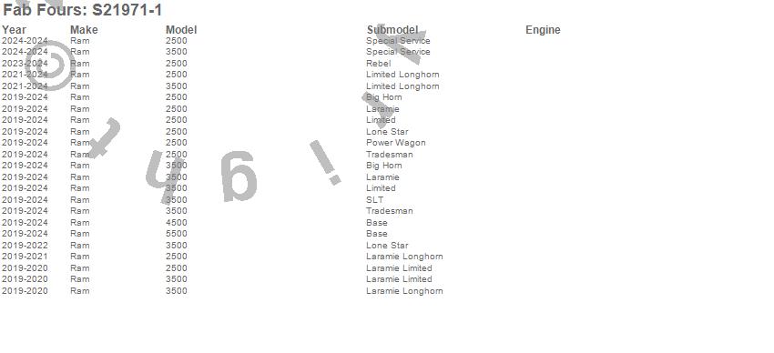 Below is an abbreviated list of applications for the Replacement Lower Guard.2500, 3500, 4500, 5500, Ram, 2025, 2024, 2023, 2022, 2021, 2020, 2019