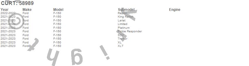 Brand: CURTPart Number: 58989Trailer Wire Connector Type: Custom Wiring - w/Backup SensorsUPC: 612314589890