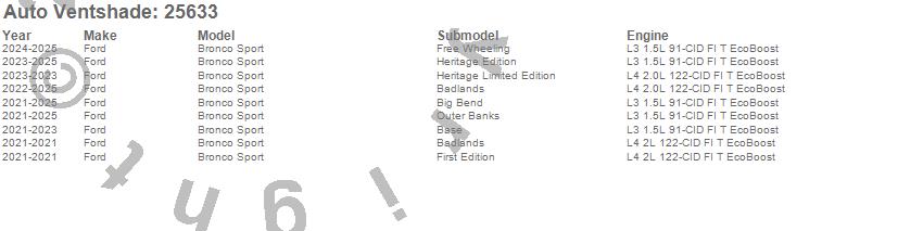Below is an abbreviated list of applications for the Bugflector II Stone/Bug Deflector.Bronco Sport, Ford, 2026, 2025, 2024, 2023, 2022, 2021