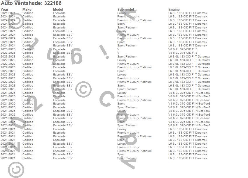 Below is an abbreviated list of applications for the Aeroskin Smoke Hood Protector.Escalade, Escalade ESV, Cadillac, 2025, 2024, 2023, 2022, 2021