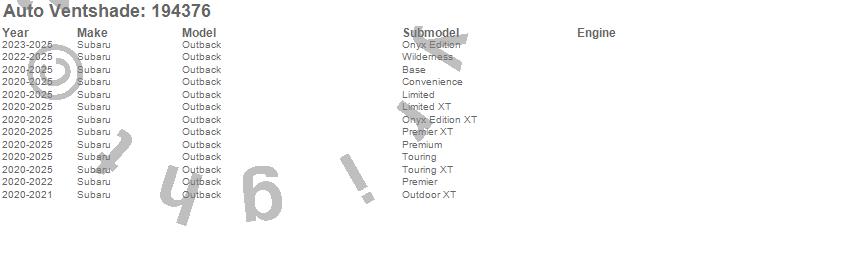 Below is an abbreviated list of applications for the Ventvisor In-Channel Deflector 4 pc..Outback, Subaru, 2025, 2024, 2023, 2022, 2021, 2020