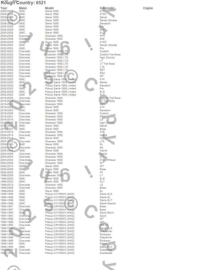 Below is an abbreviated list of applications for the U-Bolt Kit.C1500 Pickup, K1500, K1500 Pickup, Pickup Sierra 1500 Limited, Sierra 1500, Silverado 1500, Silverado 1500 LTD, Chevrolet, GMC, 2025, 2024, 2023, 2022, 2021, 2020, 2019, 2018, 2017, 2016, 2015