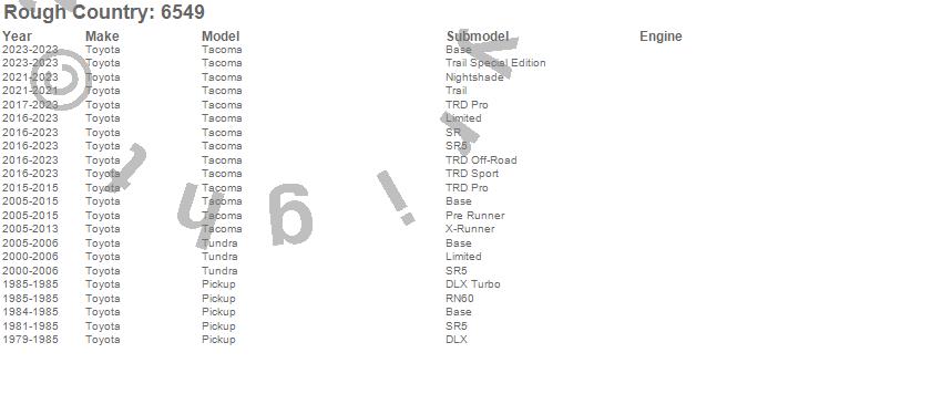 Below is an abbreviated list of applications for the U-Bolt Kit.Pickup, Tacoma, Tundra, Toyota, 2023, 2022, 2021, 2020, 2019, 2018, 2017, 2016, 2015, 2014, 2013, 2012, 2011, 2010, 2009, 2008