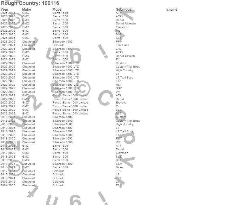 Brand: Rough CountryPart Number: 100116Suspension Air Spring Kit Type: 4-6 in. Lift - 5000 lbs. Load CapacityUPC: 843030110000
