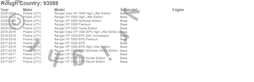 Below is an abbreviated list of applications for the Lift Kit-Suspension.Ranger Crew XP 1000 EPS High Lifter Edition, Ranger Crew XP 1000 High Lifter Edition, Ranger XP 1000, Ranger XP 1000 EPS, Ranger XP 1000 EPS 20th Anniversary, Ranger XP 1000 EPS High Lifter Edition, Ranger XP 1000 EPS Hunter Edition, Ranger XP 1000 EPS Northstar HVAC Edition, Ranger XP 1000 EPS Premium, Ranger XP 1000 EPS Ranch Edition, Ranger XP 1000 High Lifter Edition, Ranger XP 1000 Northstar Edition, Ranger XP 1000 Premium, Ranger XP 1000 Texas Edition, Polaris (UTV), 2022, 2021, 2020, 2019, 2018