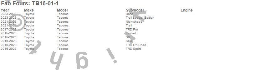 Brand: Fab FoursPart Number: TB16-01-1Bumper- Front Type: w/No Guard - 2 Stage Matte Black Powder CoatUPC: 840113723485