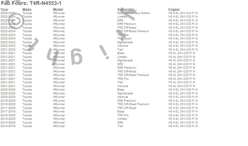 Below is an abbreviated list of applications for the Winch Mount.4Runner, Toyota, 2024, 2023, 2022, 2021, 2020, 2019, 2018, 2017, 2016, 2015, 2014