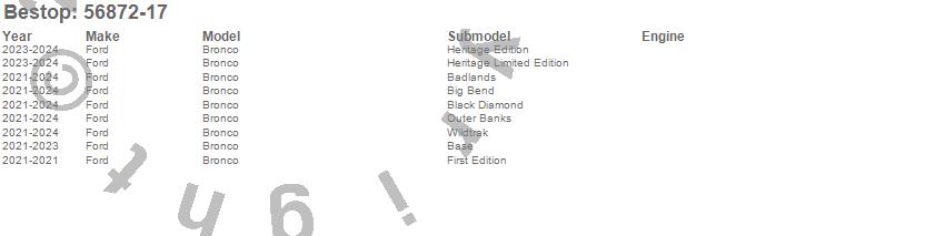 Below is an abbreviated list of applications for the Trektop Slantback Soft Top.Bronco, Ford, 2026, 2025, 2024, 2023, 2022, 2021