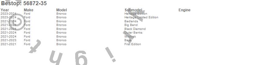 Below is an abbreviated list of applications for the Trektop Slantback Soft Top.Bronco, Ford, 2026, 2025, 2024, 2023, 2022, 2021