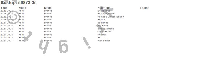 Below is an abbreviated list of applications for the Trektop Slantback Soft Top.Bronco, Ford, 2026, 2025, 2024, 2023, 2022, 2021