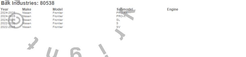 Brand: BAK IndustriesPart Number: 80538Tonneau Cover Type: Black - Vinyl Top w/ Aluminum Underside - Matte Black FinishUPC: 192631045069
