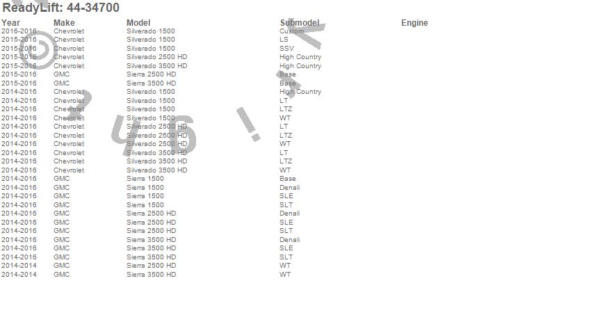 Below is an abbreviated list of applications for the Big Lift Kit w/Shocks.Sierra 1500, Sierra 2500 HD, Sierra 3500 HD, Silverado 1500, Silverado 2500 HD, Silverado 3500 HD, Chevrolet, GMC, 2016, 2015, 2014