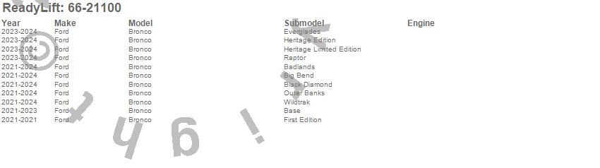 Below is an abbreviated list of applications for the Leveling Kit.Bronco, Ford, 2025, 2024, 2023, 2022, 2021