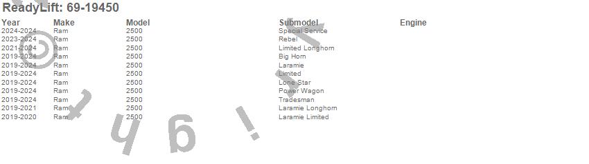 Brand: ReadyLiftPart Number: 69-19450Lift Kit-Suspension Type: 4.5 LiftUPC: 194933167388
