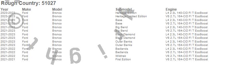 Below is an abbreviated list of applications for the Suspension Lift Kit.Bronco, Ford, 2025, 2024, 2023, 2022, 2021