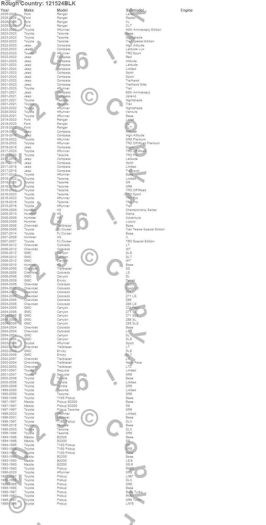 Below is an abbreviated list of applications for the Wheel Installation Kit.4Runner, B2200, B2300, Bronco, Canyon, Colorado, Compass, Envoy, FJ Cruiser, H3, Pickup, Ranger, Sequoia, T100 Pickup, Tacoma, Trailblazer, Tundra, Chevrolet, Ford, GMC