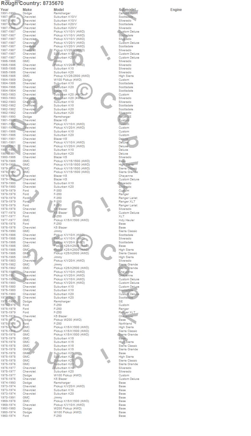 Below is an abbreviated list of applications for the Steering Stabilizer.Blazer K5, F-250, F-350, Jimmy, K10 Pickup, K10 Suburban, K15 Suburban, K1500 Pickup, K20 Pickup, K20 Suburban, K25 Pickup, K25 Suburban, K2500 Pickup, K5 Blazer, Ramcharger, V10 Pickup, V10 Suburban, V20 Pickup, V20 Suburban, W100 Pickup