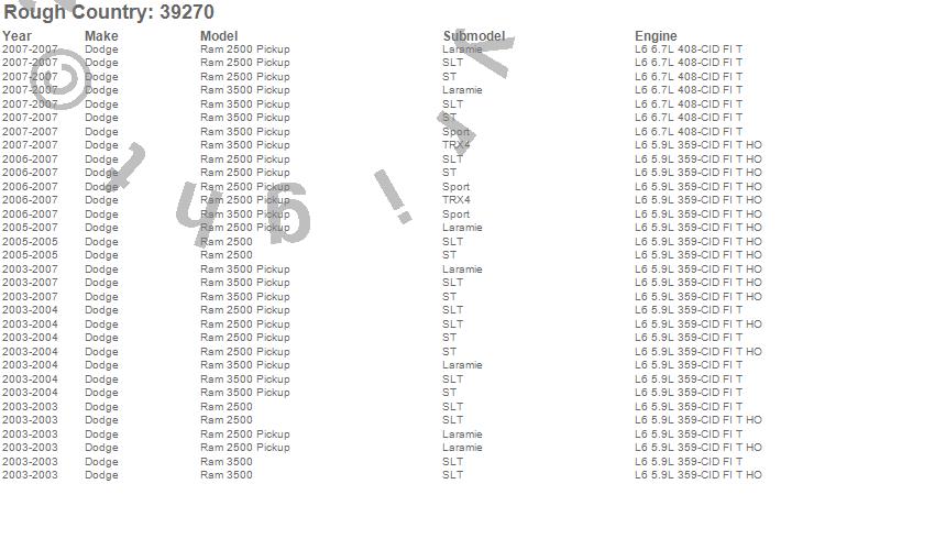Below is an abbreviated list of applications for the Suspension Lift Kit w/Shocks.Ram 2500, Ram 3500, Dodge, 2007, 2006, 2005, 2004, 2003