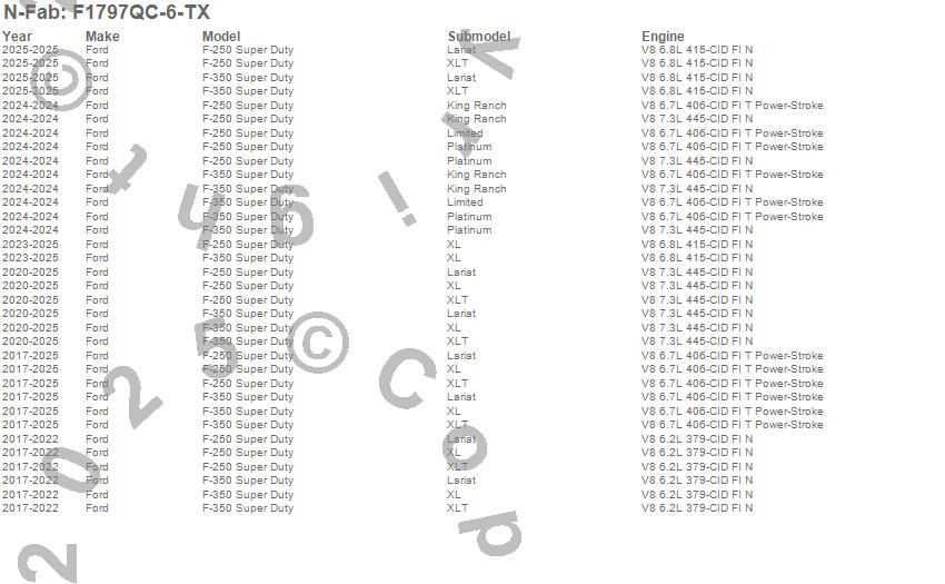 Below is an abbreviated list of applications for the Wheel To Wheel Nerf Step Bar w/Bed Access.F-250 Super Duty, F-350 Super Duty, Ford, 2025, 2024, 2023, 2022, 2021, 2020, 2019, 2018, 2017
