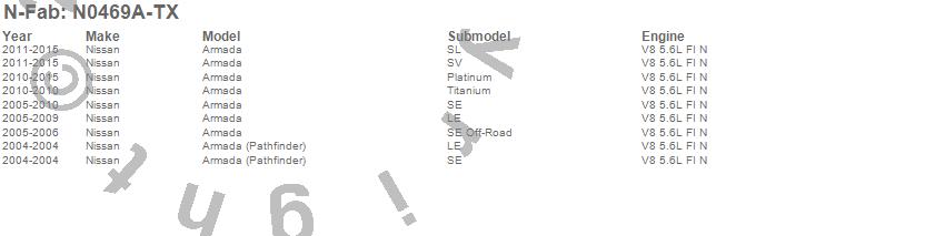 Below is an abbreviated list of applications for the Wheel To Wheel Nerf Step Bar.Armada, Armada (Pathfinder), Nissan, 2015, 2014, 2013, 2012, 2011, 2010, 2009, 2008, 2007, 2006, 2005, 2004