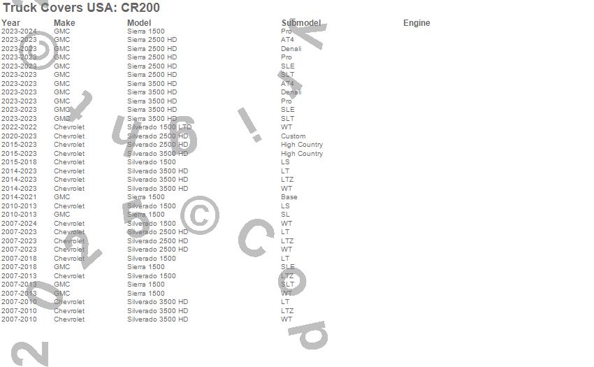 Below is an abbreviated list of applications for the American Roll Cover.Sierra 1500, Sierra 2500 HD, Sierra 3500 HD, Silverado 1500, Silverado 1500 LTD, Silverado 2500 HD, Silverado 3500 HD, Chevrolet, GMC, 2024, 2023, 2022, 2021, 2020, 2019, 2018, 2017, 2016, 2015, 2014